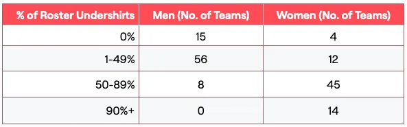 The data suggests that adoption is far from random. Across college basketball, roughly 24% of men’s players wear undershirts compared to 64% of women’s players (Power Five). But averages only tell part of the story. On the men’s side, undershirt usage is scattered: 15 men’s teams have zero players wearing undershirts, and no men’s team reaches even 90% roster adoption. In contrast, women’s basketball shows clear clustering. Fourteen women’s teams have 90% or more of their roster wearing undershirts, and nearly 80% of women’s teams have at least half their players wearing one.