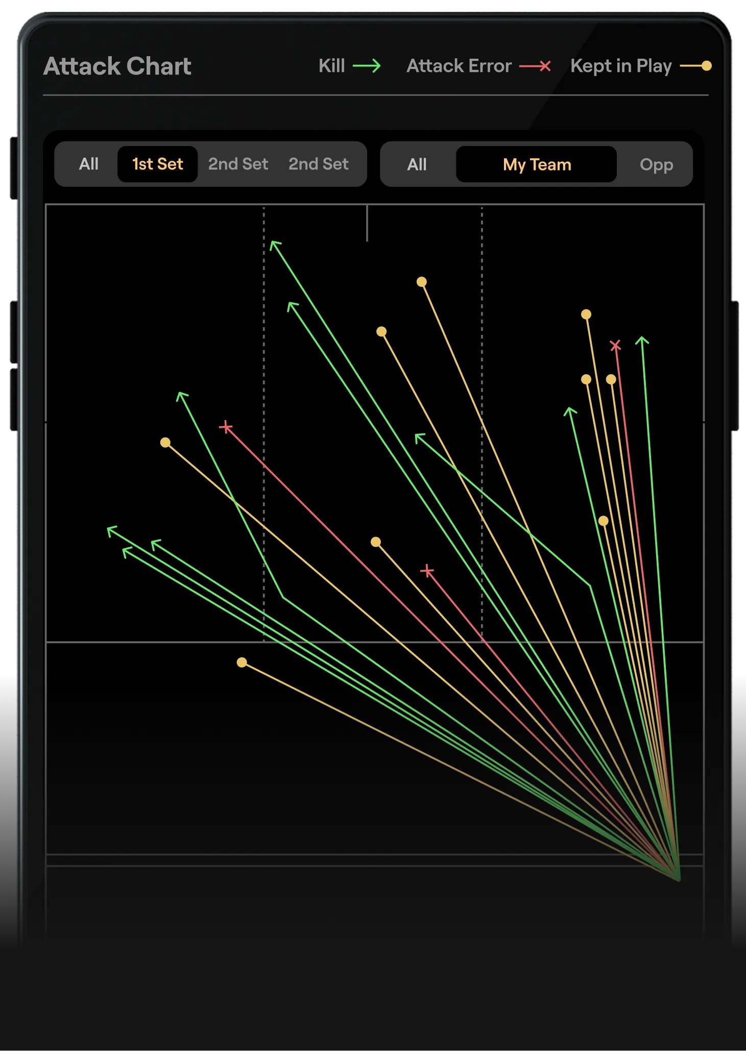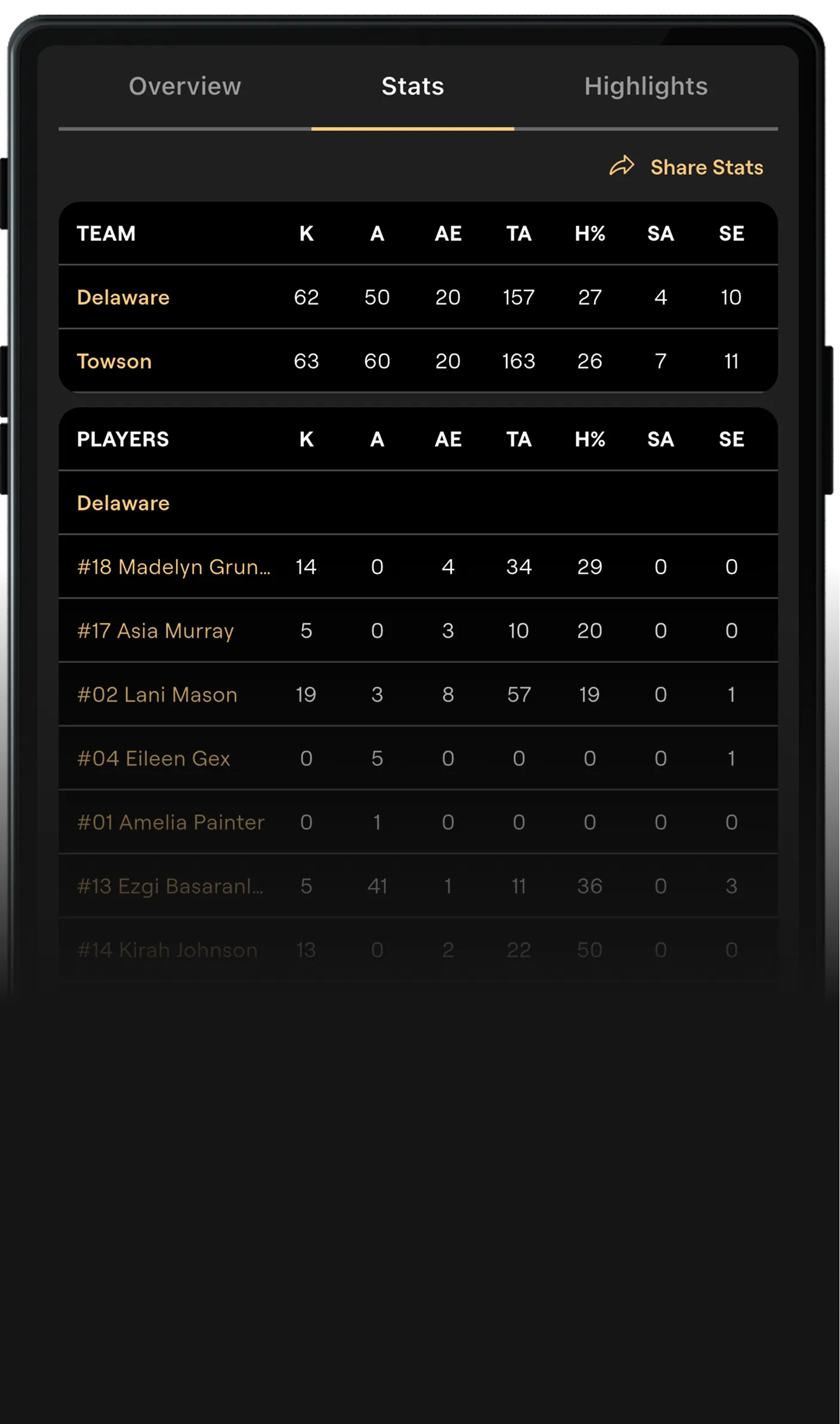 Track player and team performance across key stats like kills, digs, assists, blocks, hitting efficiency and more.