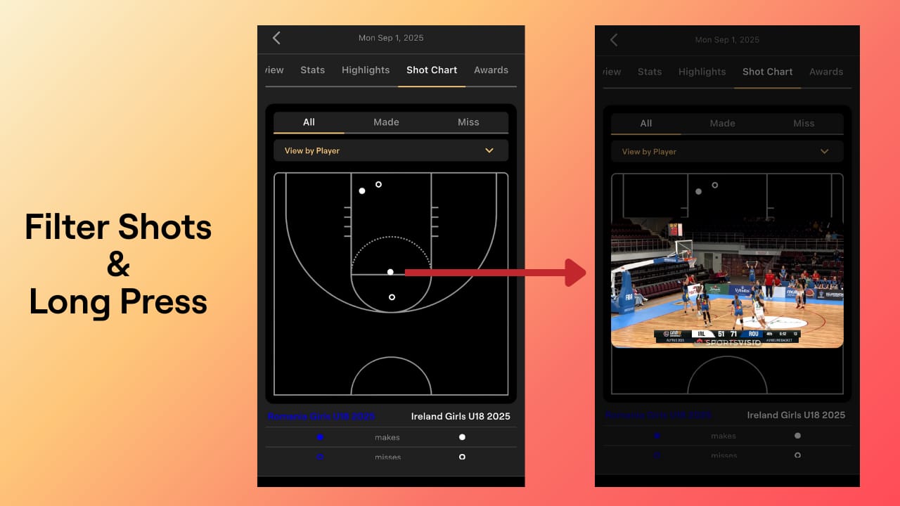 This one's a game-changer. Every shot on the chart is now interactive. Click any make or miss to jump directly to the video of that possession. No more scrubbing through film to find that one outlier mid-range jumper. Click it. Watch what's happening.